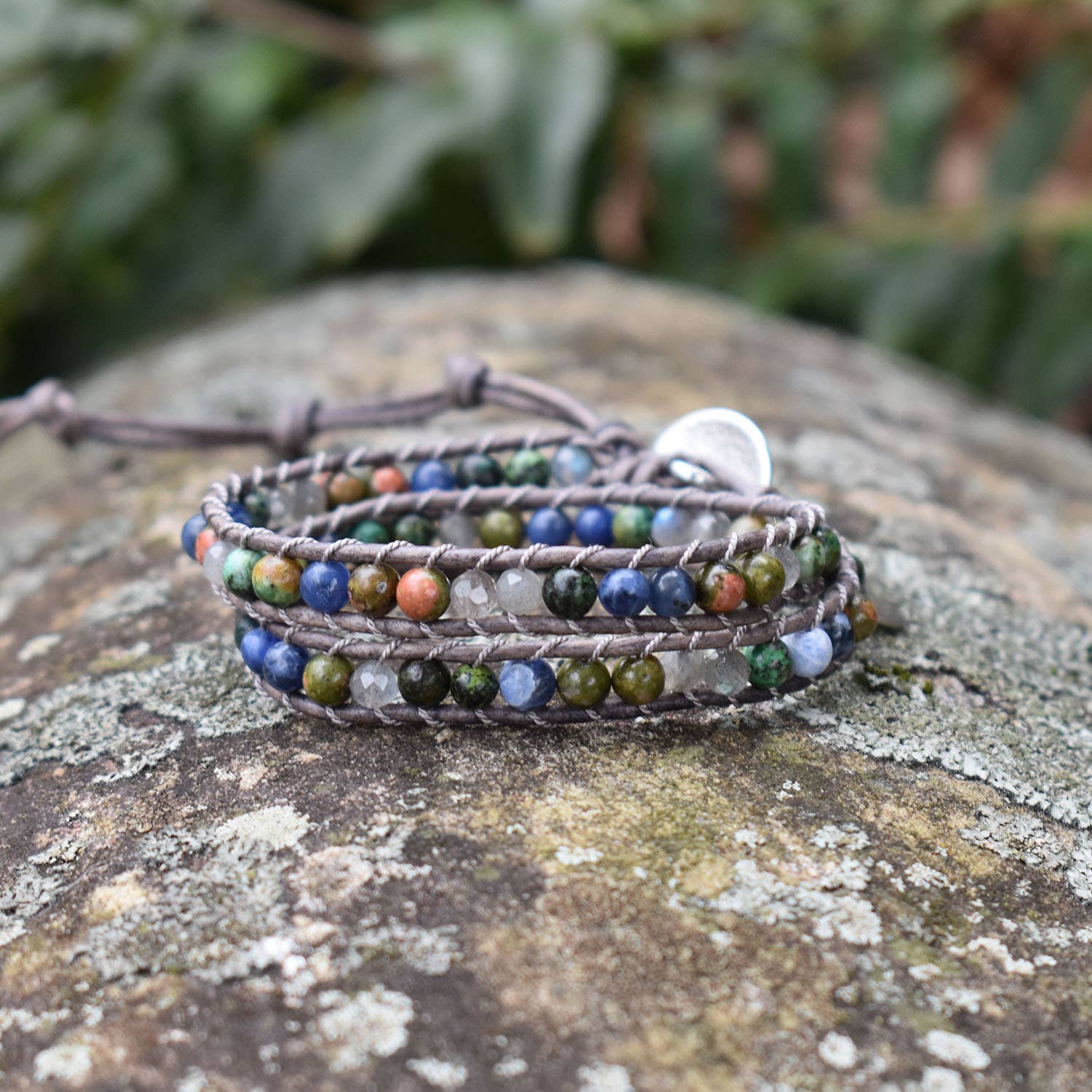 African Turquoise, Labradorite, Sodalite, and Unakite Gemstones with natural gray genuine leather and silk cord, this handmade double wrap bracelet has an adjustable silver button and loops for that perfect fit.